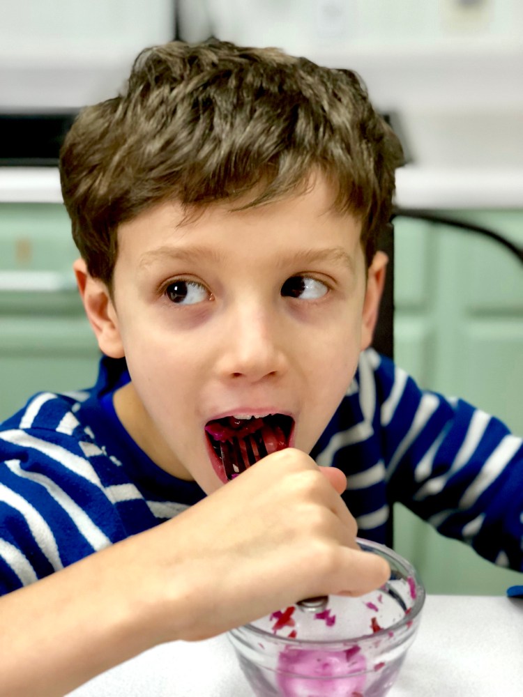 My kids love kraut, but it took a couple of times to sway them. Now I have to stop them from overeating it! If they see you enjoy it, they are way more likely to accept such a different (in American standards) kind of food. Start small also for gut reasons. As you eat good bacteria, it starts causing die off of the bad bacteria. As they die, they release toxins that cause digestive discomfort. Swapping out the bad for the good is always a win! Do you see a gross expression on my son’s face? Not a chance.